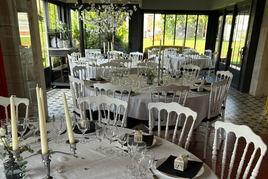 Possibilité de louer des mange-debout, vaisselles et couverts pour les cocktails.